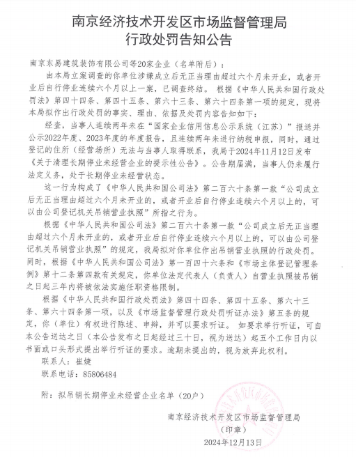 南京经济技术开发区市场监督管理局行政处罚告知公告